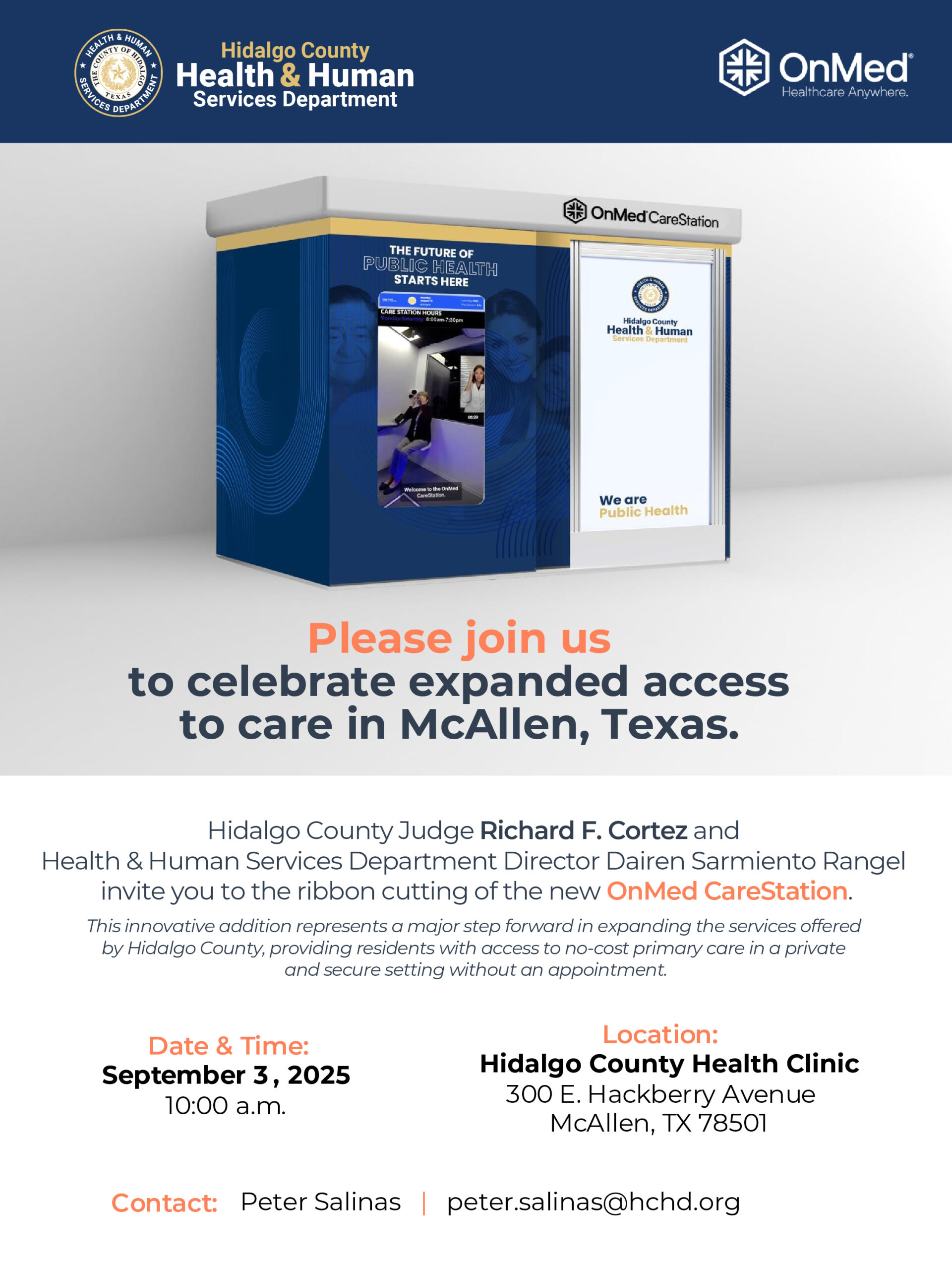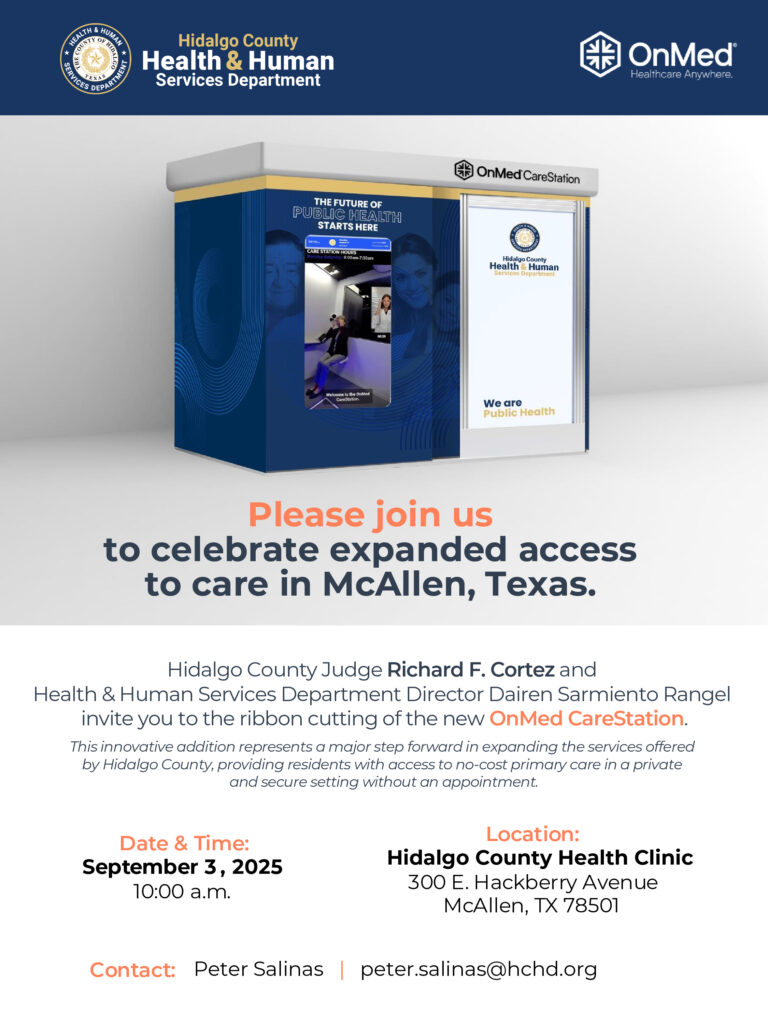The Hidalgo County Health & Human Services Department (HCHD) will host a ribbon cutting for the first OnMed CareStation in the Rio Grande Valley, located at the department’s McAllen Clinic location in Hidalgo County. The CareStation introduces free primary care services at this site, expanding the clinical options available to county residents.