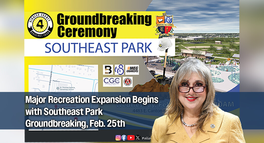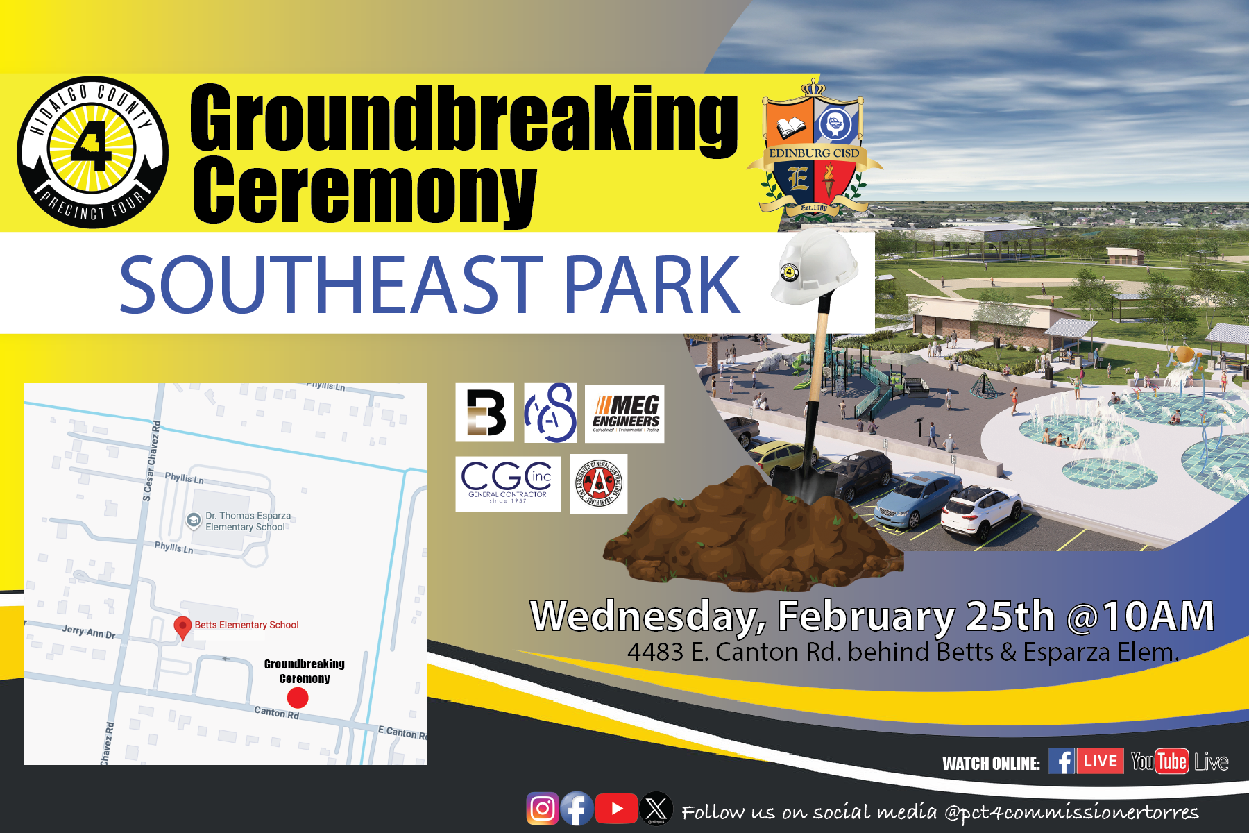 EDINBURG, Texas – Commissioner Ellie Torres, in partnership with Edinburg Consolidated Independent School District, will host a groundbreaking ceremony to mark the beginning of construction for the new Southeast Park, Wednesday, February 25 at 10:00 a.m. at 4483 E. Canton Rd. Edinburg, TX (Behind Betts Elementary School and Esparza Elementary School)