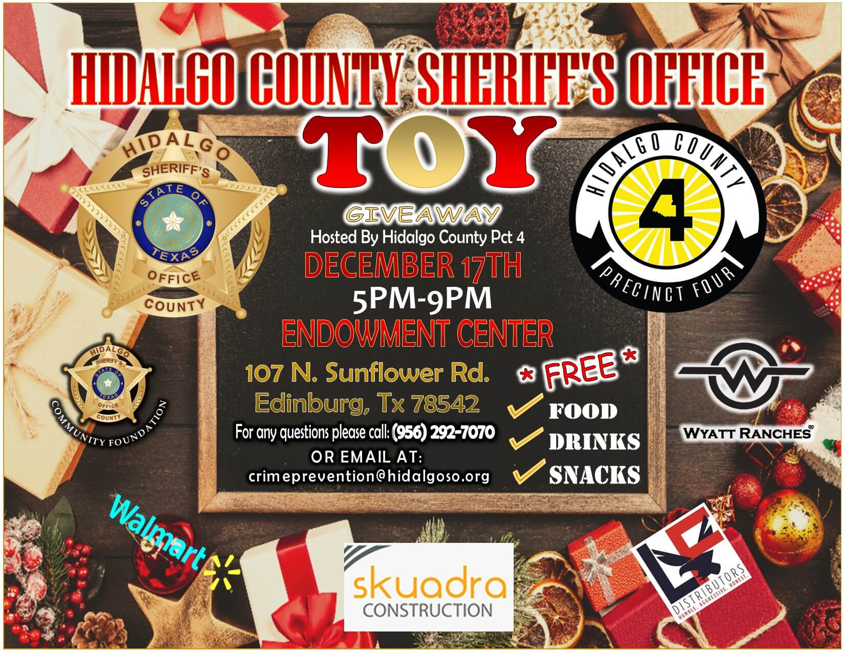 EDINBURG, Texas — The Hidalgo County Sheriff’s Office and Hidalgo County Precinct 4 Commissioner Ellie Torres are excited to announce a collaborative Toy Giveaway and Holiday Celebration taking place on Wednesday, December 17th, from 5 PM to 9 PM at the Precinct 4 Alfonso Flores All Star Park located at 107 Sunflower Rd. in Edinburg.