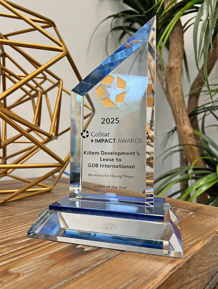 Mission-McAllen, Texas— Killam Development is proud to announce that it has been awarded the prestigious 2025 CoStar Impact Award for “Lease of the Year” for its successful deal with GDB International, a leading recycling and sustainability solutions company based in New Brunswick, New Jersey, with warehouses and offices located around the U.S., China, Ghana and Mexico.