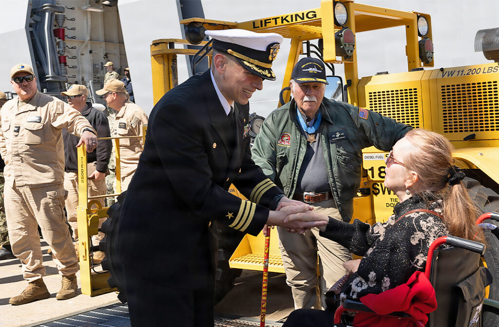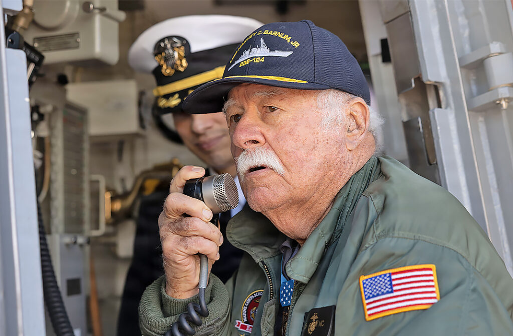 The warship’s namesake, retired Marine Corps Col. Harvey Curtiss Barnum Jr., a Medal of Honor recipient, was on the pier to welcome the ship and its crew.