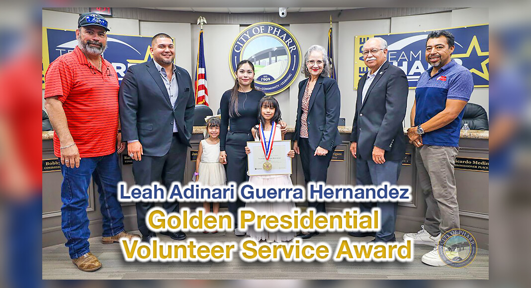 The Pharr City Commission proudly recognizes Leah Adinari Guerra Hernandez for receiving the prestigious Golden Presidential Volunteer Service Award. The award is presented to individuals who meet specific service hour requirements, with the Gold level recognizing those who have demonstrated exceptional service, typically contributing over 500 hours of volunteer work in a year.
