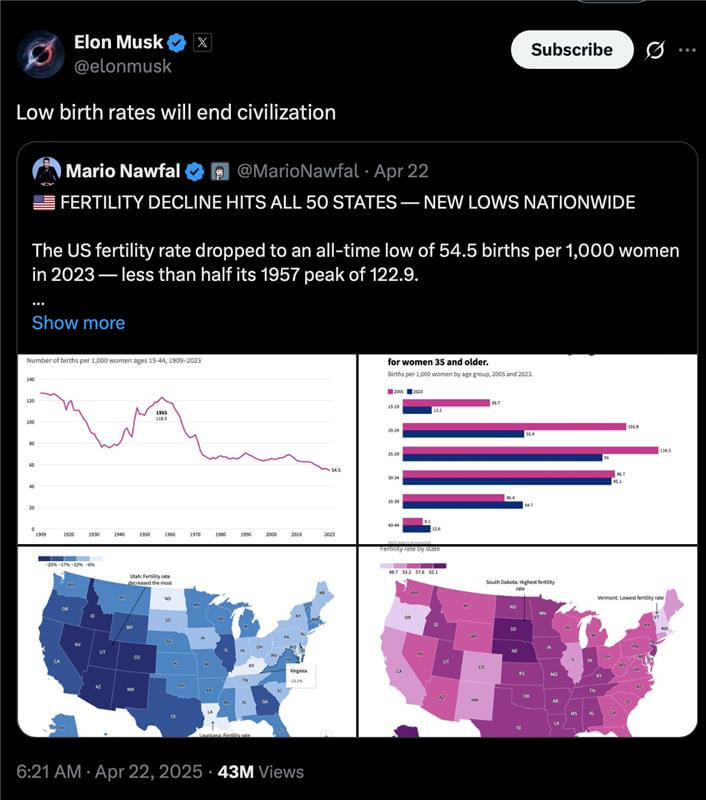 April 23, 2025– Elon Musk has once again turned the spotlight on a looming demographic crisis. In a post on X, he warned: “Low birth rates will end civilization.” While the statement may sound dramatic, the underlying data supports a sobering reality—America is experiencing a steep and widespread fertility decline.