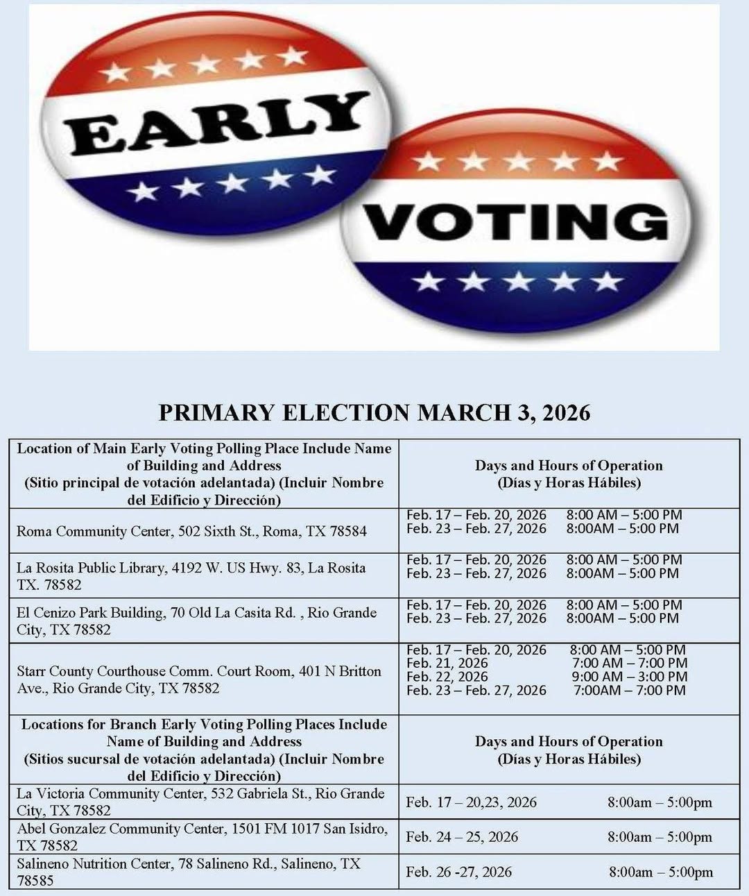 Hidalgo County voters can refer to the provided documents for early voting and Election Day polling locations, while Cameron County voters can find location information through the county’s elections website.