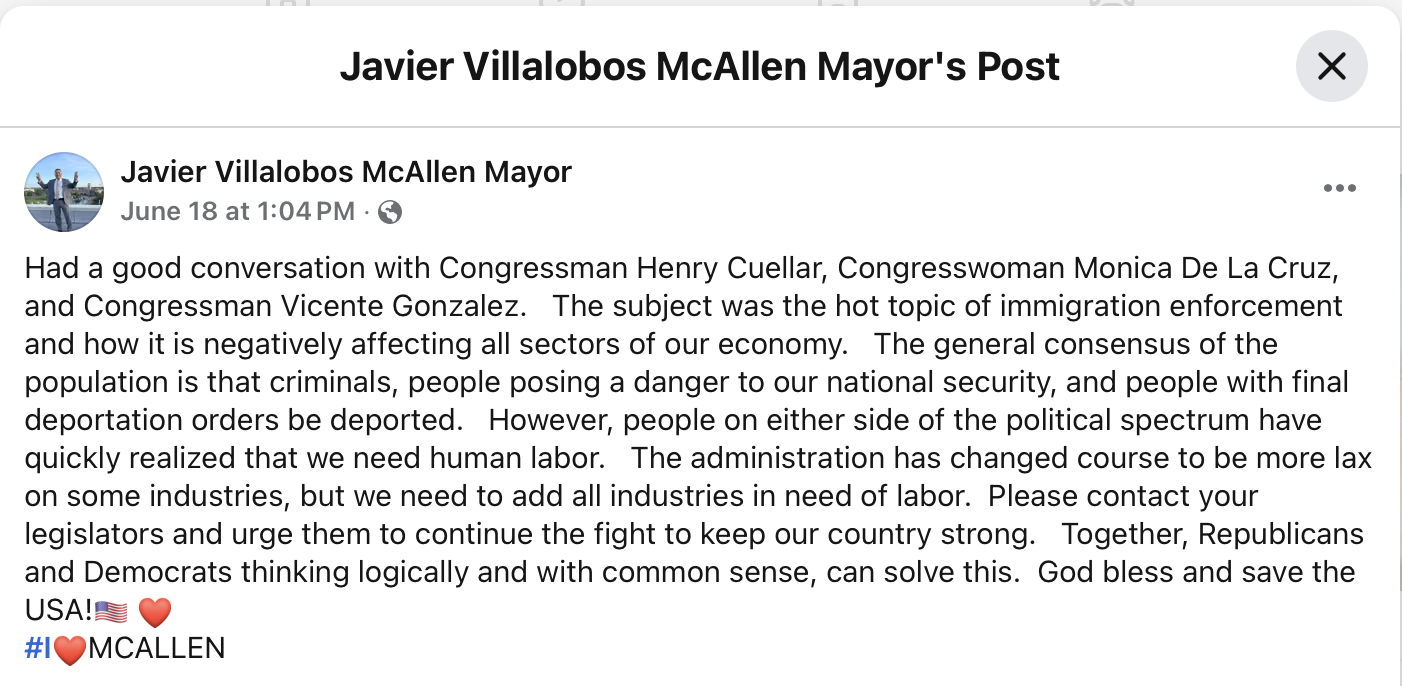 He also referenced a recent discussion with Congressman Henry Cuellar, Congresswoman Monica De La Cruz, and Congressman Vicente Gonzalez. The bipartisan meeting focused on how enforcement-only strategies, while removing bad actors, have also hurt industries dependent on immigrant labor, from agriculture to retail. In response to a Facebook post by Frank Estrada asking, “Asking an honest question, did Congresswoman De La Cruz agree with you?” Villalobos replied: “Yes.”