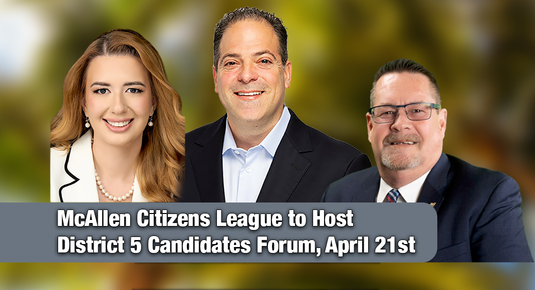 The McAllen Citizens League (MCL) will host a candidates forum for the McAllen City Commission District 5 Special Election on Tuesday, April 21, 2026, from 11:30 a.m. to 1:30 p.m. at the DoubleTree Hotel, 1800 S. 2nd Street in McAllen. All District 5 candidates are expected to participate. MCL has served the community since 1952 by hosting luncheon meetings that bring important public issues to the forefront.
