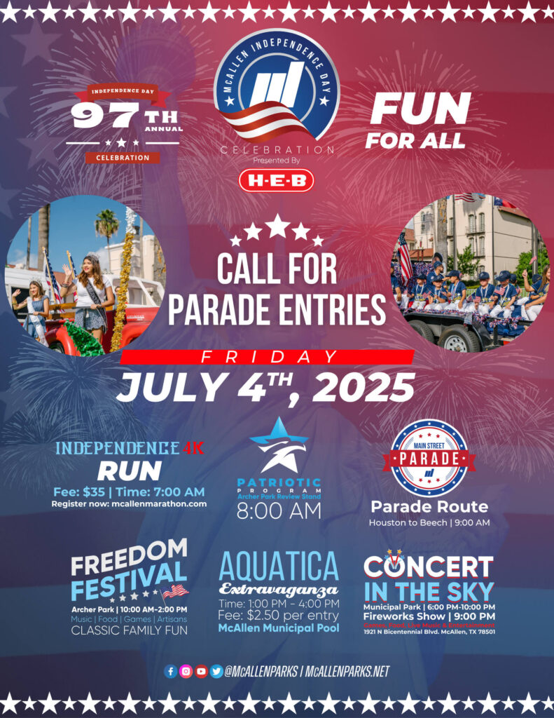 The City of McAllen is getting ready for this year’s McAllen Independence Day Celebration, presented by H-E-B, and is inviting the community to take part in all of the patriotic festivities. The 97th Annual Independence Day Celebration will take place on Friday, July 4,2025 with an early morning 4K race, a patriotic program, immediately followed by the Main Street Parade and then Freedom Festival, a family-friendly festival held at Archer Park. Music, food, and games will be highlights of the events. The event will conclude with the H-E-B Concert in the Sky Fireworks Extravaganza.