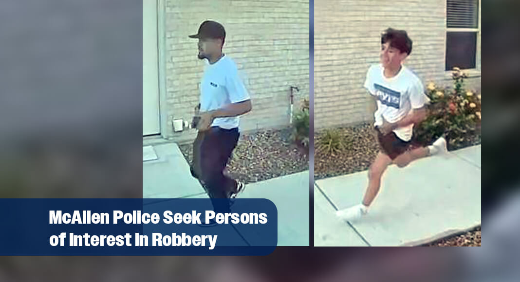 McAllen Police Officers are asking for the public’s assistance in locating persons of interest in a Robbery investigation. McAllen Police Officers investigate a report of a Robbery, occurring on September 10, 2025. The incident occurred on the 5900 block of Swallow Avenue, in McAllen, Texas. The victim was sitting in his vehicle when two male individuals approached him and demanded his property. The victim was assaulted in the course of the robbery and various personal items were taken from the victim. The suspects fled the scene on foot.