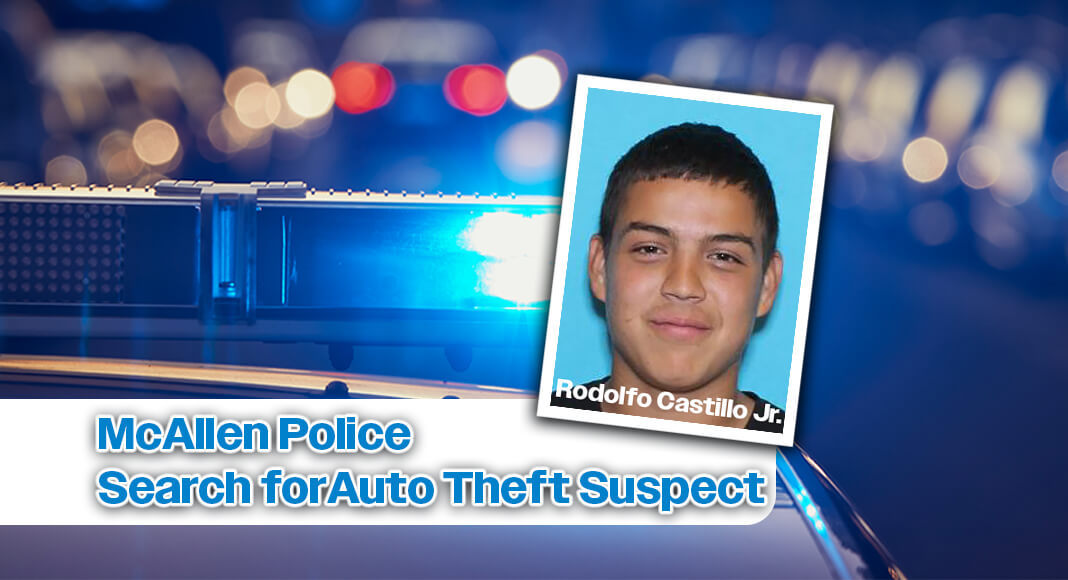 McAllen Police Officers are asking the public’s assistance in locating a suspect in a motor vehicle theft investigation. A magistrate in the McAllen Municipal Court determined probable cause is established to issue warrants of arrest for Rodolfo Castillo Jr. for Motor Vehicle Theft, a Third Degree Felony, and Engaging in Organized Criminal Activity, a Second Degree Felony.