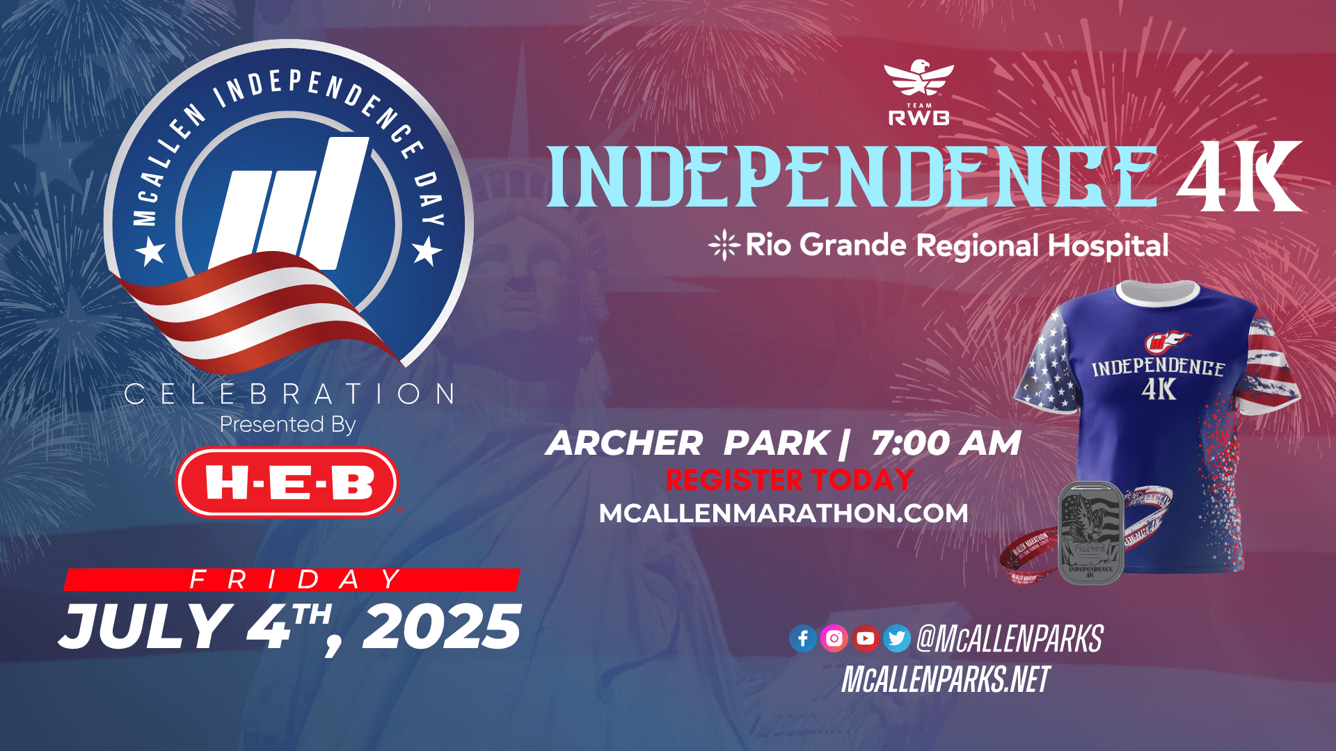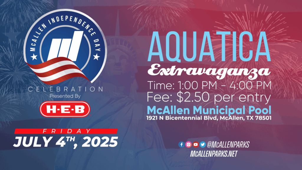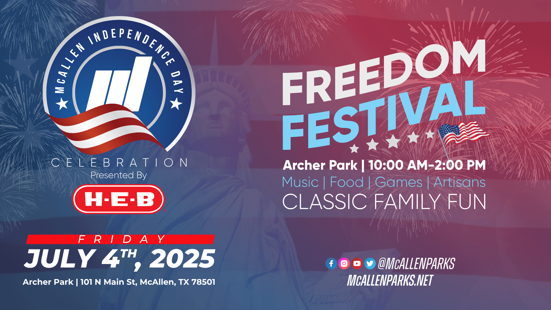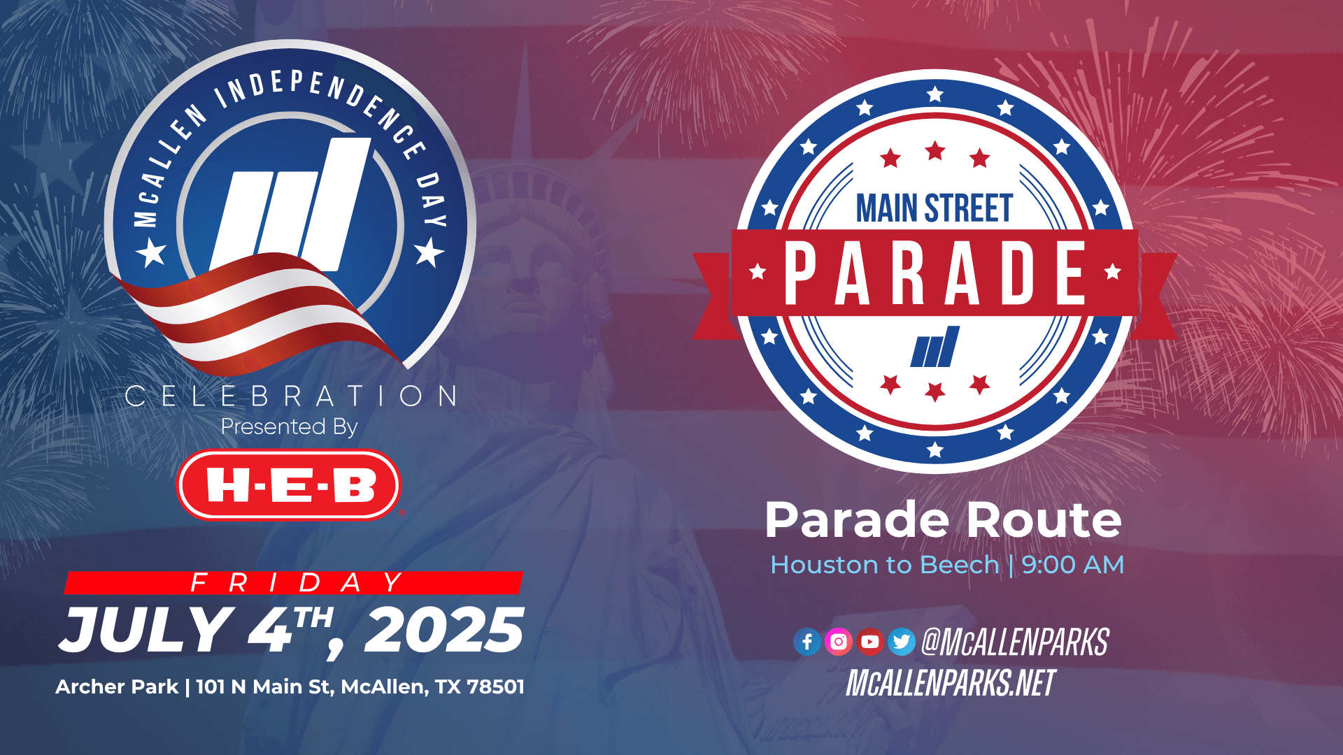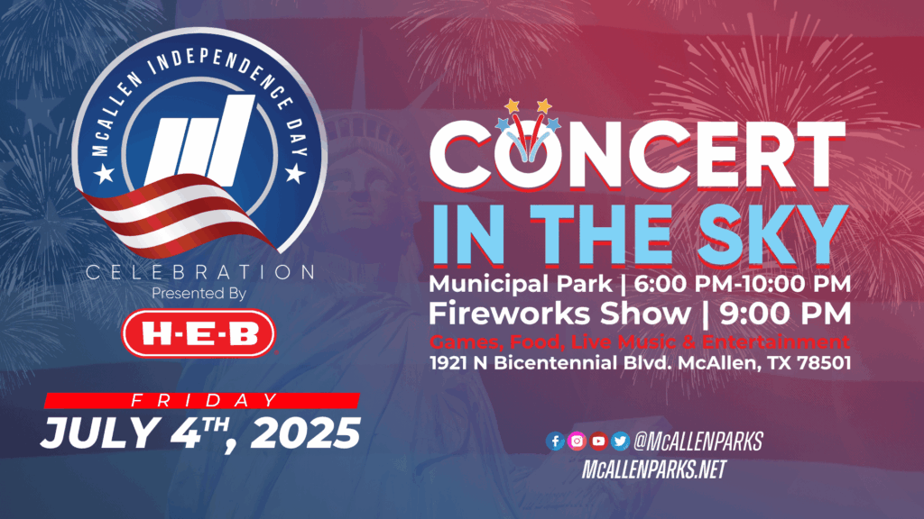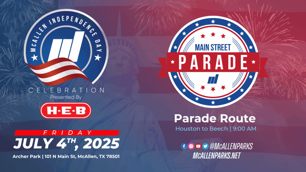The City of McAllen is inviting the community to celebrate America’s birthday at the 97th Annual Independence Day Celebration, presented by H-E-B, on Friday, July 4, 2025. The day-long celebration will feature family-friendly events including a 4K race, Patriotic Program, the Main Street Parade, a lively Freedom Festival and the H-E-B Concert in the Sky Fireworks Extravaganza.