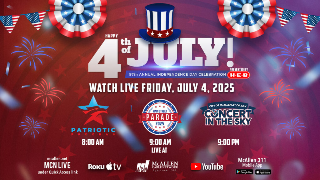 Those unable to attend in person can watch the program and parade live on MCN 1300 (Spectrum) or stream it on the City of McAllen website, 311 mobile app, the City’s YouTube Channel or by downloading the McAllen Cable Network on their Roku or Apple TV.