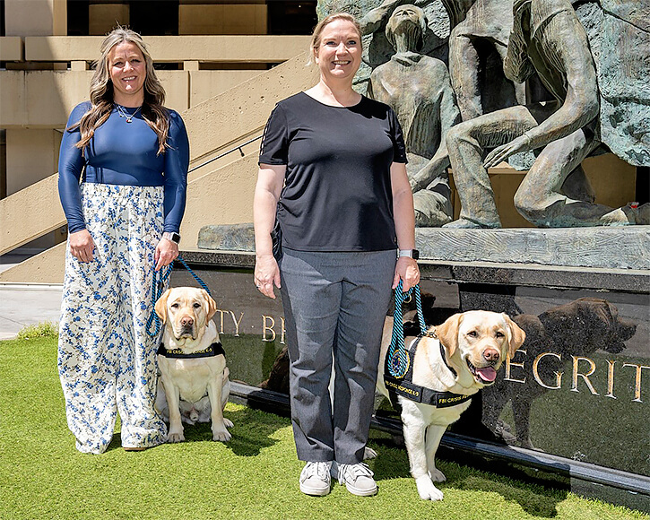 Taz and Peg join the FBI family as certified crisis response canines (CRCs). These dogs are specially trained to support victims of crime and foster trust among impacted communities. CRCs also help victims find the courage and confidence to share their experiences in sensitive settings, such as investigative interviews and on the witness stand in court.