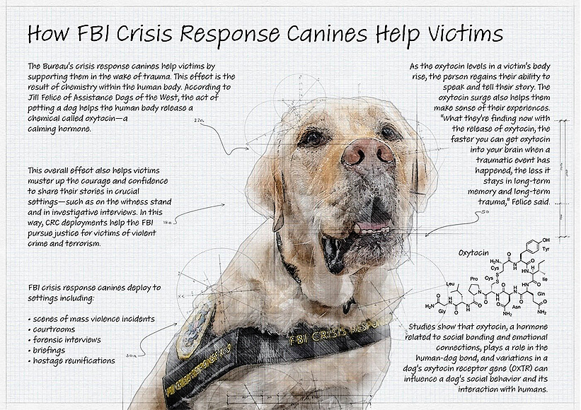 And over the course of an investigation and judicial process, crisis response canines can help victims calm their nerves enough to share their stories with investigators and juries, alike. In turn, this helps our Justice Department partners secure convictions in violent crime and terrorism cases.