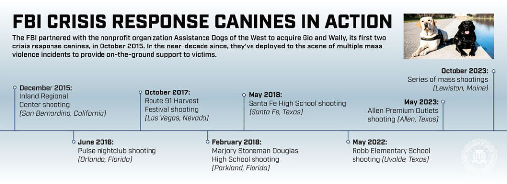 “Early on, the mission of the program really was to leverage the canine-human bond to mitigate stress and anxiety of victims following mass violence incidents,” said Melody, who was paired with Gio in what became one of the Bureau’s first crisis response canine teams.