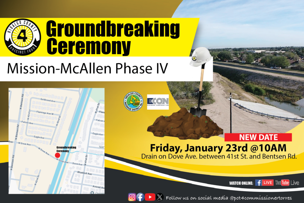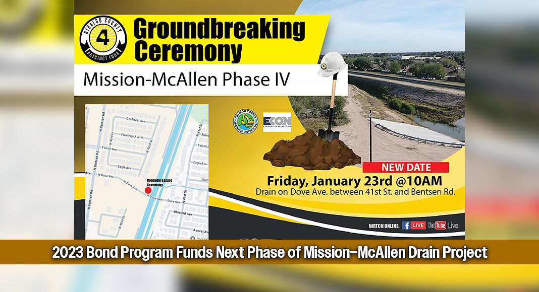 McALLEN, Texas – Hidalgo County Precinct 4 has announced the postponement of the groundbreaking ceremony for Mission–McAllen Drain Phase IV, originally scheduled for Wednesday, January 21.