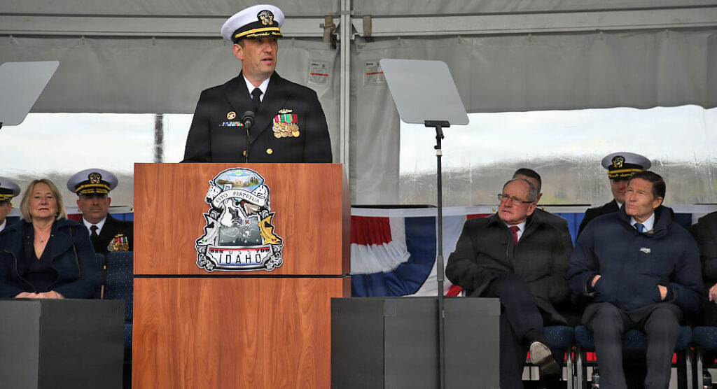 Navy Cmdr. Chad J. Guillerault, commanding officer of the Idaho, addressed the attendees, speaking on behalf of the crew and the submarine’s rich heritage.