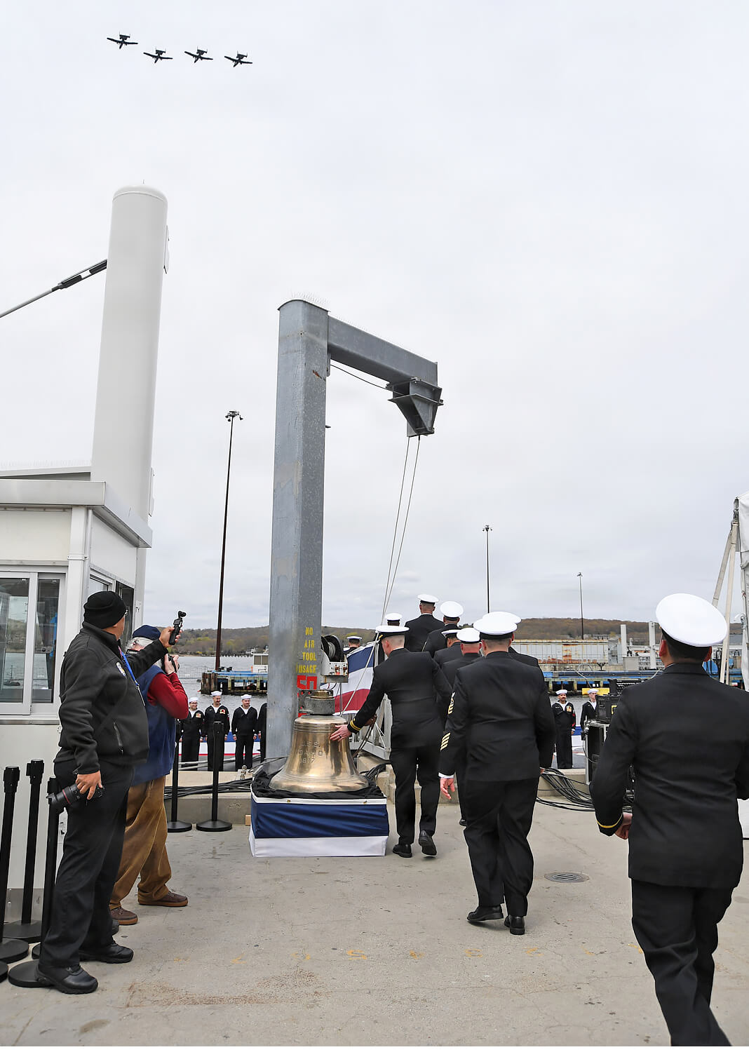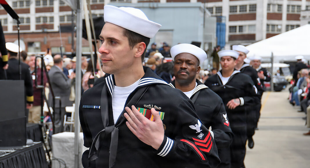 The ship’s sponsor, Teresa Stackley, gave the traditional order to “man our ship and bring her to life,” at which point the crew ceremonially ran aboard to man the submarine.