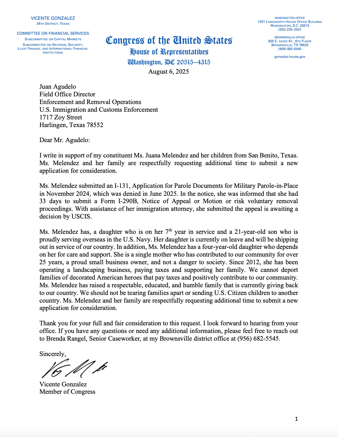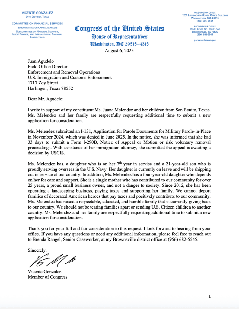 SAN BENITO, TEXAS – Congressman Vicente Gonzalez has formally intervened in the pending deportation case of Juana Melendez, a long-time South Texas resident, business owner, and mother of two active-duty U.S. military service members. In a letter dated August 6, 2025, addressed to Juan Agudelo, Field Office Director for U.S. Immigration and Customs Enforcement (ICE) in Harlingen, Texas, the congressman urged the agency to grant Ms. Melendez additional time to submit a new application for Military Parole-in-Place (PIP).