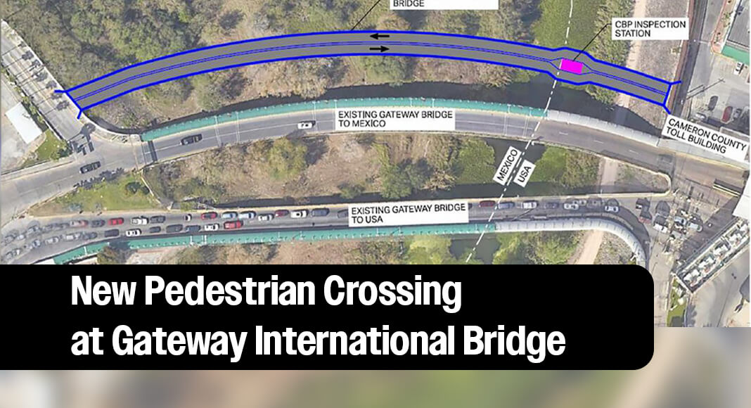 The new Gateway Pedestrian International Bridge will be located in downtown Brownsville and Matamoros. The 2-lane bridge will cross over the Rio Grande and link United States and Mexico in the urbanized areas of downtown Brownsville and Matamoros. This $10 Million bridge project will complement retail development in the tourist sections of Brownsville and Matamoros.