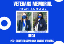 Veterans Memorial High School DECA students named Chapter Campaign Award winners. VMHS DECA President Fernanda Gonzalez and President-Elect Layla Choat are both members of this incredible team that has just advanced to the International Career Development Conference in Los Angeles, California. The team is still waiting on details on how the conference will work due to pandemic restrictions.