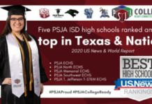 Pharr-San Juan-Alamo ISD’s high schools are ranked among the top 500 in the State of Texas and in the Nation, according to the 2020 US News & World Report, with PSJA T. Jefferson T-STEM Early College High School ranked among the top 100.
