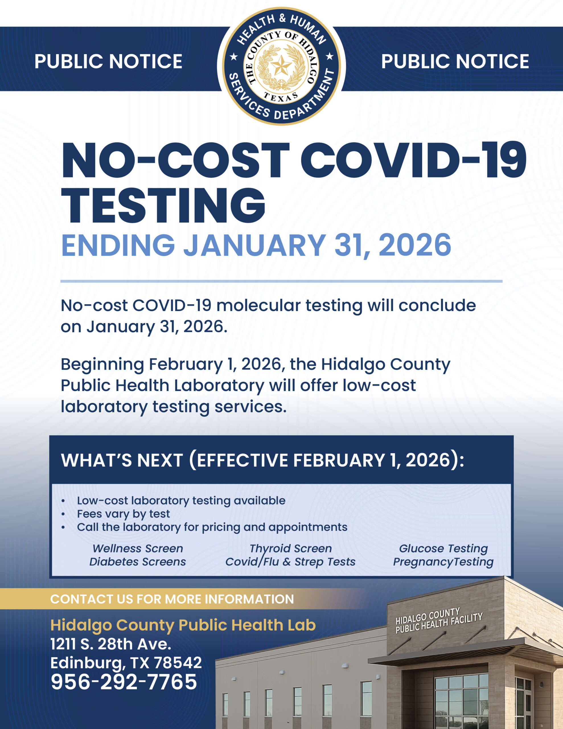 The Hidalgo County Health & Human Services Department announces that no-cost COVID-19 testing at the Hidalgo County Public Health Laboratory will conclude on January 31, 2026.