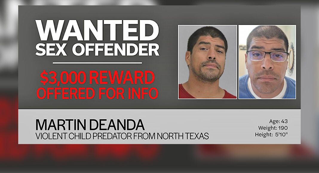 Martin Deanda, 43, of Dallas, has been wanted out of Dallas Co. since January 2025 for his failure to comply with sex offender registration requirements. In January 2023, he was convicted in Anderson Co. of aggravated sexual assault of a child.
