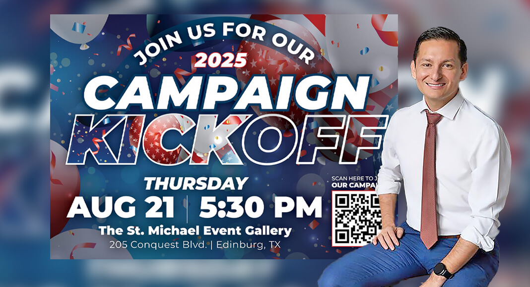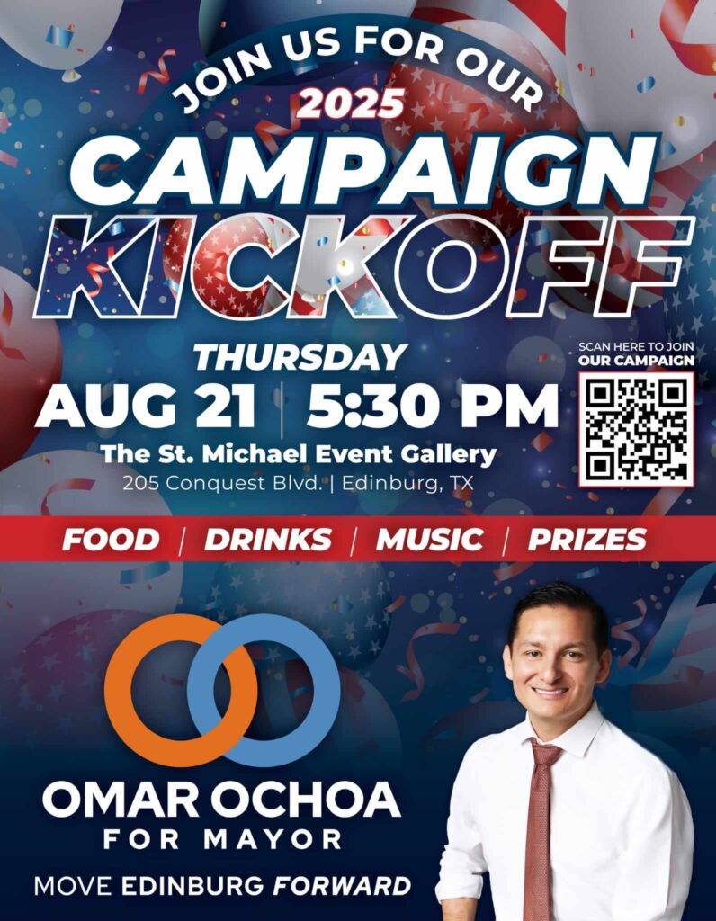 The Omar Ochoa for Edinburg Mayor Campaign Kickoff will be held at 5:30 pm TOMORROW, Thursday, August 21, 2025, at The St. Michael Event Gallery (205 Conquest Blvd.) in Edinburg. All media and the public are invited to attend and learn more about his priorities for Edinburg.