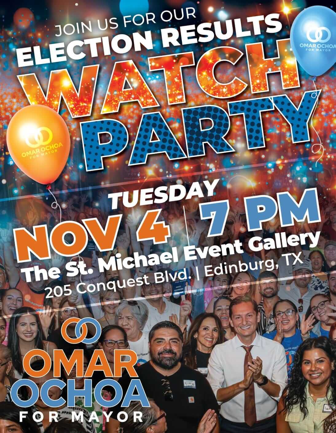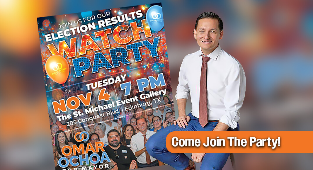 Everyone is invited to join Omar Ochoa at 7 pm on Tuesday, November 4, 2025, at The St. Michael Event Gallery (205 Conquest Blvd.) in Edinburg to watch live election coverage and results.