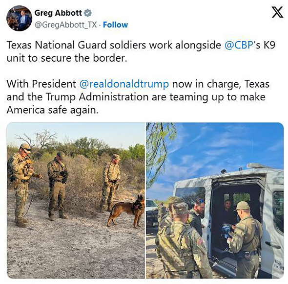 On Monday, Governor Abbott took to X, formally known as Twitter, to highlight the partnership between Texas National Guard soldiers and U.S. Customs and Border Protection’s (CBP) K-9s as they continue to secure the southern border.