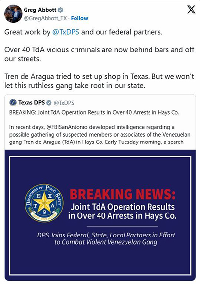 Last week, Governor Abbott touted on X the incredible work of DPS and federal partners on the joint operation that resulted in the arrest of over 40 Tren de Aragua (TdA) gang members.
