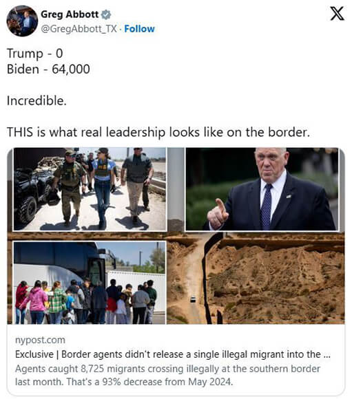 On Tuesday, Governor Abbott highlighted President Donald Trump’s success at securing the border and safeguarding the country, as border agents did not release a single illegal immigrant into America last month.