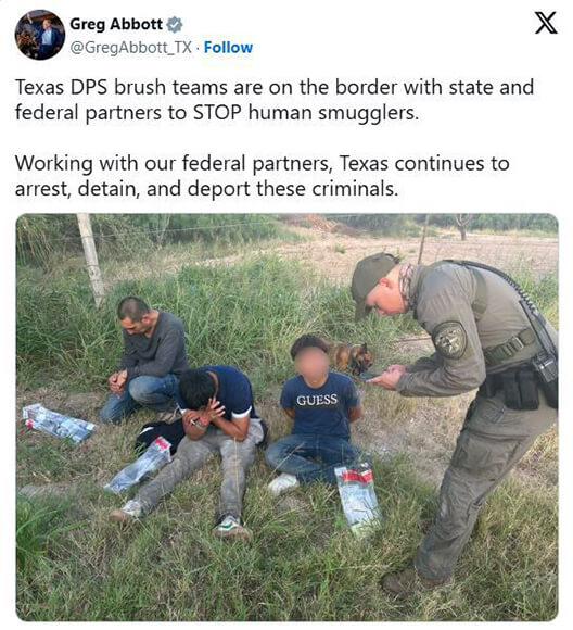 Last week, Governor Abbott shared photos on X, formerly known as Twitter, of DPS brush teams assisting federal partners to arrest, detain, and deport human smugglers.