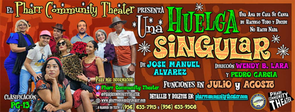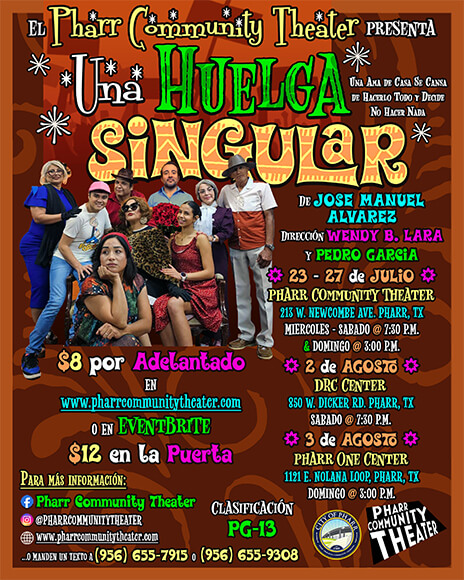 A Singular Strike, entirely in Spanish, will have seven performances in Pharr from July 23 to August 3. The first five performances will be at the Pharr Community Theater at 213 W. Newcombe Ave., Pharr, from July 23 to July 26, Wednesday through Saturday at 7:30 p.m. and Sunday, July 27 at 3:00 p.m. Then touring to two more venues, the show will open on Saturday, August 2 at the DRC in south Pharr at 850 W. Dicker Rd., at 7:30 p.m., and the final performance will be on Sunday, August 3 at Pharr One at 1121 E. Nolana Loop in Pharr, at 3:00 p.m.