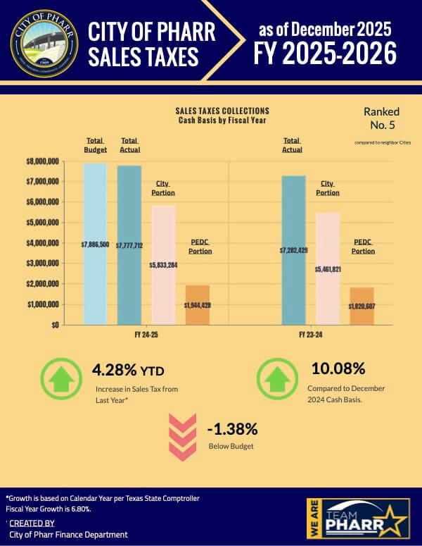 The Pharr City Commission recently reviewed the December 2025 Sales Tax Collection Report, which highlights continued revenue growth for the city. Year‑to‑date collections are up 4.28% compared to December 2024, while December alone saw a strong 10.08% increase over the same month last year. For Fiscal Year 2025–2026, sales tax collections have risen 6.80% to date, underscoring Pharr’s steady economic expansion and overall economic strength.