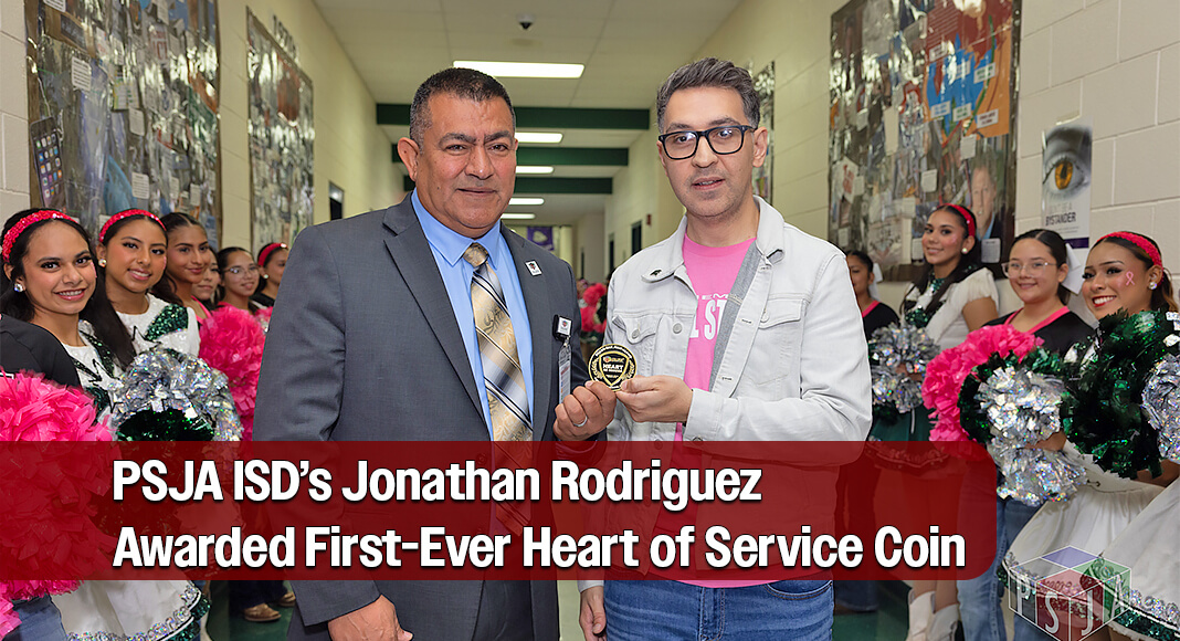 PHARR, Texas – Pharr-San Juan-Alamo ISD made district history today as Superintendent Dr. Alejandro Elias presented the first-ever PSJA Heart of Service Coin to Jonathan Rodriguez, U.S. History Teacher at PSJA Memorial Early College High School, for his heroic and compassionate actions in protecting a student.