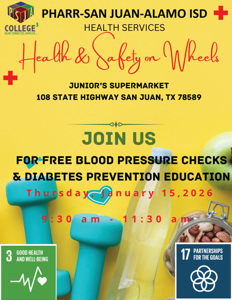 ALAMO – The Pharr-San Juan-Alamo ISD (PSJA ISD) Health Services Department, in partnership with the PSJA Police Department, will host the Health and Safety on Wheels event on Thursday, January 15, 2026, at Junior’s Supermarket in San Juan, Texas at 9:30 a.m.