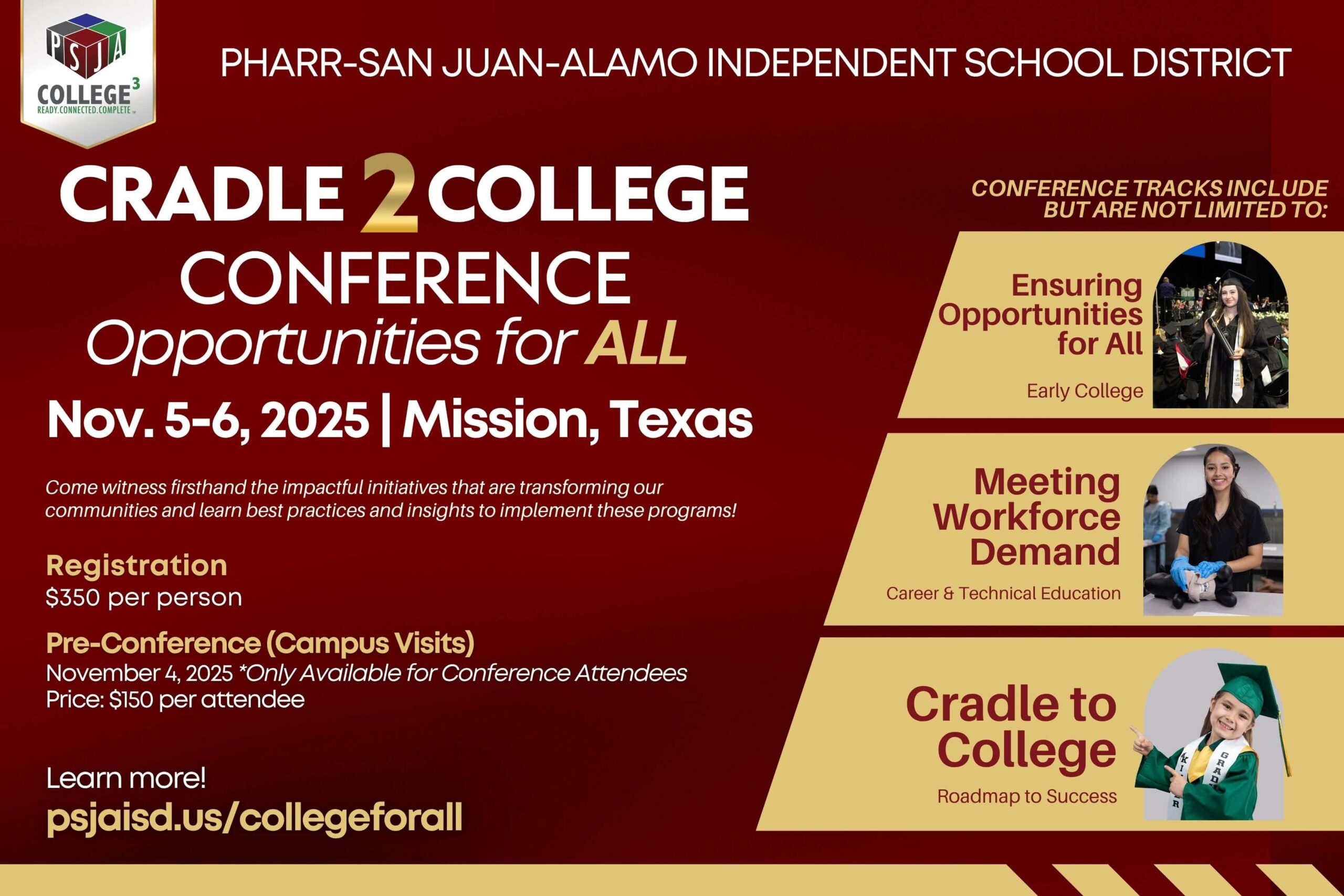 MISSION, Texas – Pharr-San Juan-Alamo Independent School District (PSJA ISD) will host its Cradle to College Conference (formerly PSJA College for All Conference) at the Mission Event Center on November 5-6, 2025, beginning at 7:30 AM.