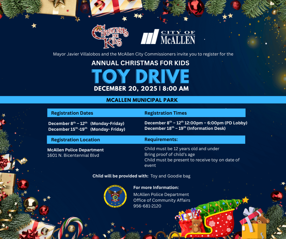 The McAllen Police Department is proud to announce that registration will continue this next week for the 18th Annual Christmas for Kids program, a beloved holiday tradition that brings joy and gifts to children across our community. This year’s celebration will take place on Saturday, December 20, 2025, where hundreds of toys will be distributed thanks to the generosity of local businesses, organizations, and community sponsors.