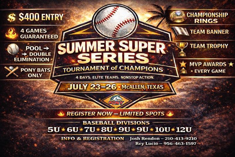 McALLEN, Texas – The 2026 PONY Summer Super Series: International Tournament of Champions will bring elite teams from across the Rio Grande Valley, Texas, Louisiana, Oklahoma, and Mexico, as they have selected McAllen to host their July tournament.
