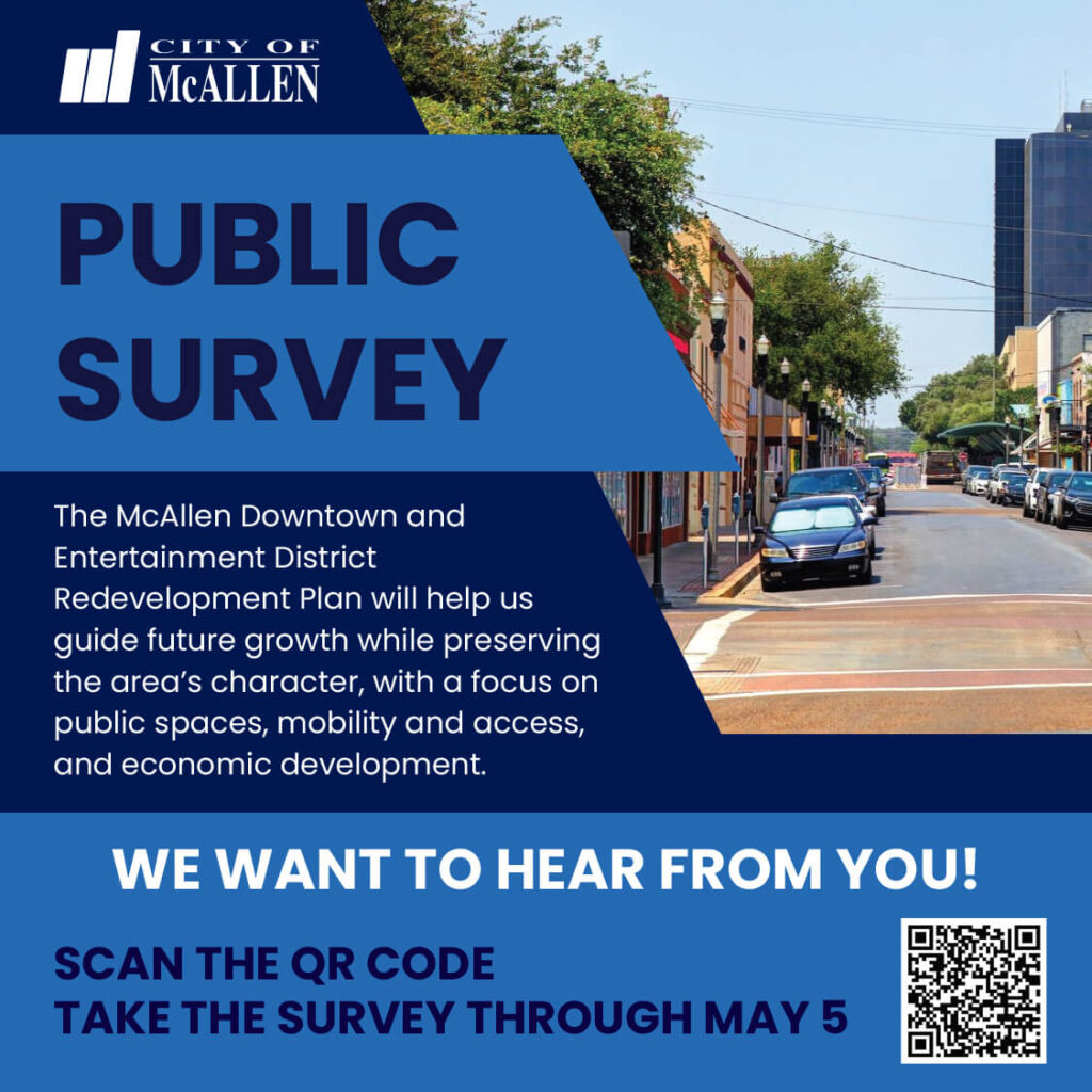 McAllen Residents are invited to share their thoughts through a public survey supporting the Downtown and Entertainment District Redevelopment Plan. Community feedback will play a key role in shaping priorities for public spaces, mobility and accessibility, and future economic development efforts.