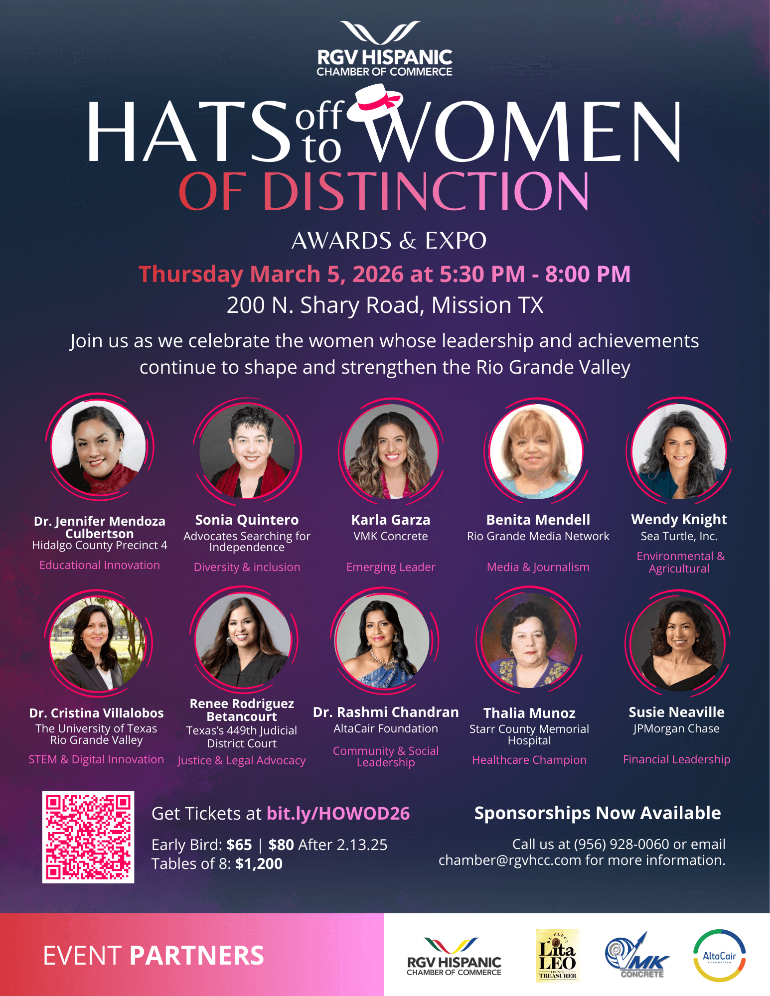 MISSION, Texas — The Rio Grande Valley Hispanic Chamber of Commerce will honor the 2026 recipients of its Women of Distinction Awards during the annual Hats Off to Women of Distinction Awards & Expo on Thursday, March 5, at the Mission Event Center (200 N. Shary Road).