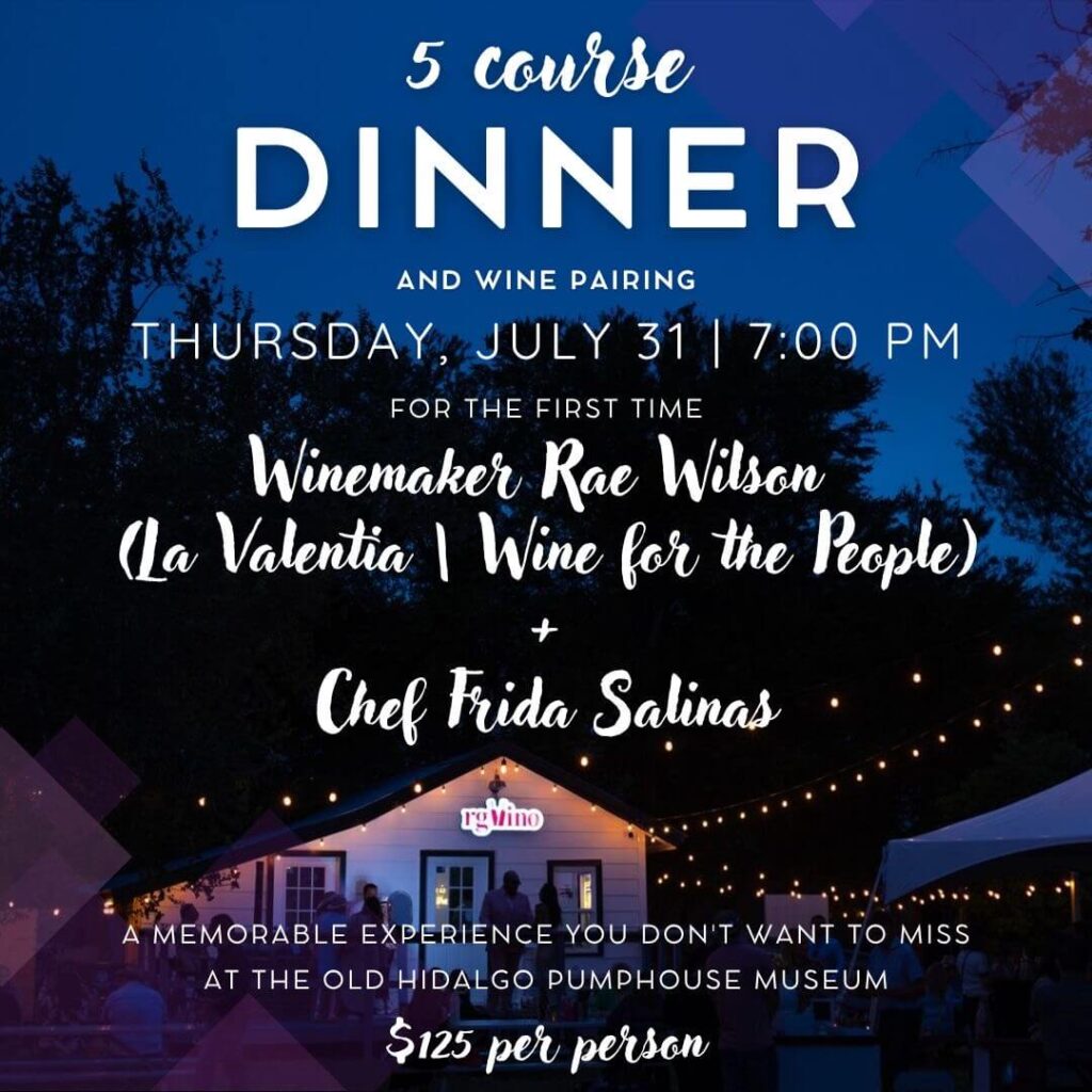 Hidalgo, Texas — Experience the synergy of world-class wine and elevated local cuisine on Thursday, July 31 at 7 PM, when renowned winemaker Rae Wilson—creator of La Valentía and visionary behind Wine for the People—teams up with rising local Chef Frida Salinas for an unforgettable 5‑course dinner and wine pairing, at the historic Old Hidalgo Pumphouse Museum. Hosted by RGVino, this event is part of its ongoing mission to bring the Rio Grande Valley community new and memorable culinary experiences featuring Texas and Mexican wines.