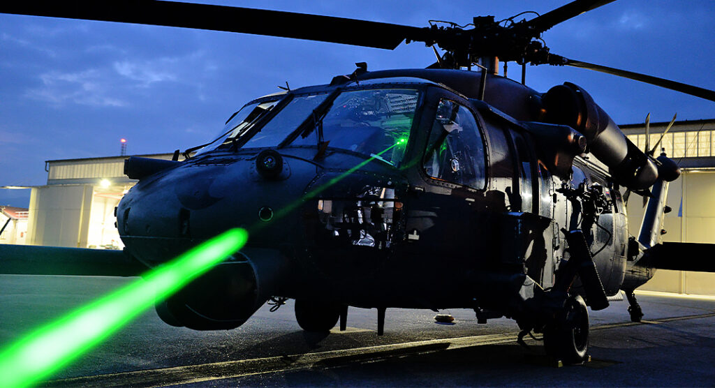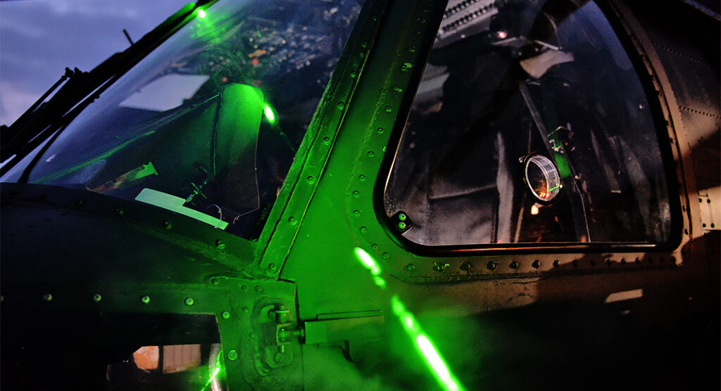 Air Force Master Sgt. Miguel Gibson, a flight safety manager assigned to the 31st Fighter Wing, demonstrates how pointing a laser at an HH-60 Pave Hawk can illuminate the cockpit at Aviano Air Base, Italy, Oct. 12, 2023. Laser strikes on aircraft, often referred to as “lasing,” have become a growing concern for aviation safety in recent years, as it can cause blindness, distraction and potential long-term eye damage to pilots and crew members. Pointing a laser at an aircraft became a federal crime in 2012 and can result in up to five years in prison and a $250,000 fine. Photo Credit: Air Force Airman 1st Class Hannah Stubblef via US Department of War
