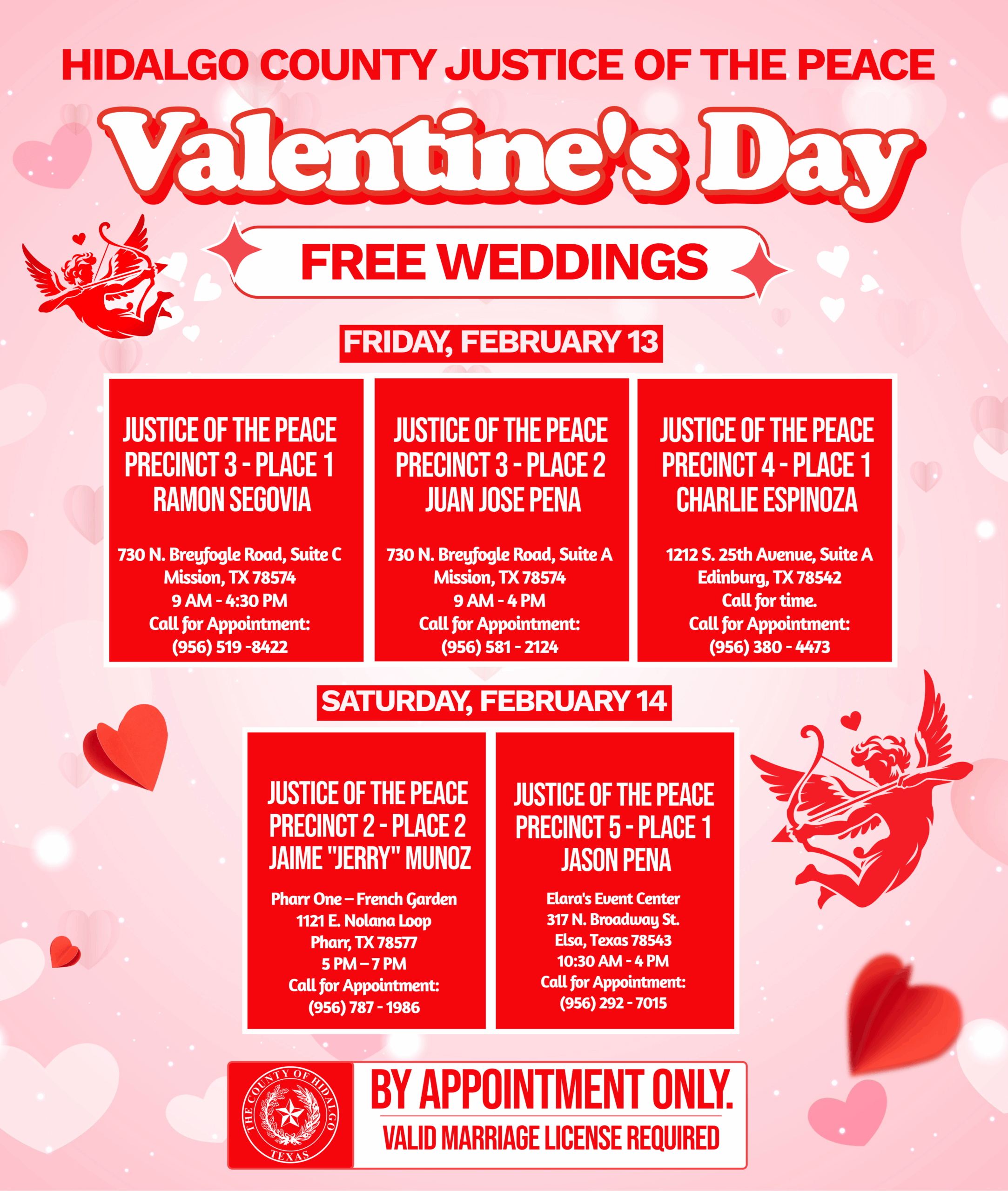 Love is in the air at our Hidalgo County Justice of the Peace offices! Several Our JP’s plan to offer free weddings in celebration of Valentine’s Day. The JP’s below will be officiating free weddings on the following dates and locations: