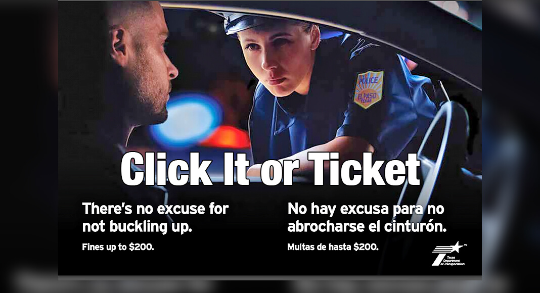 The Click It or Ticket campaign is an important part of TxDOT’sDrive like a Texan: Kind. Courteous. Safe. initiative.Drive like a Texan is about embracing the pride, camaraderie and responsibility of being a Texan on the road. By making thoughtful choices, we can all help keep each other safe. Learn more at DriveLikeATexan.com.