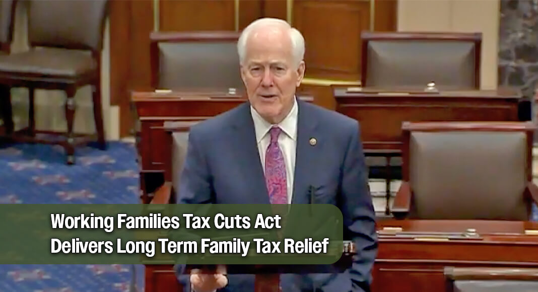 WASHINGTON, DC – U.S. Senator John Cornyn (R-TX) touted the pro-family and childcare provisions Republicans delivered in the Working Families Tax Cuts to alleviate the costs Texas parents face, including by doubling the Child Tax Credit, lowering the cost of childcare, and strengthening the Paid Family and Medical Leave Credit. Excerpts of Sen. Cornyn’s remarks are below, and video can be found here.