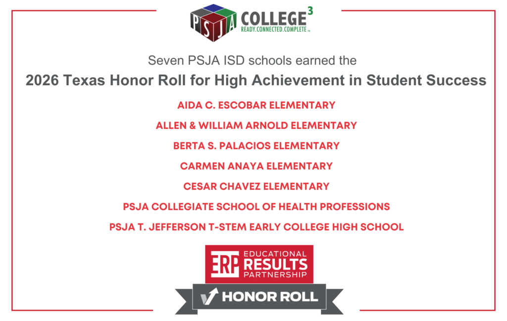 PHARR, Texas – Seven Pharr-San Juan-Alamo ISD schools have been named to the 2025 Texas Honor Roll, presented by Educational Results Partnership (ERP). Sponsored by the Campaign for Business and Education Excellence (CBEE), the program is part of a national initiative to recognize high-performing schools and districts that are making measurable gains in student achievement.