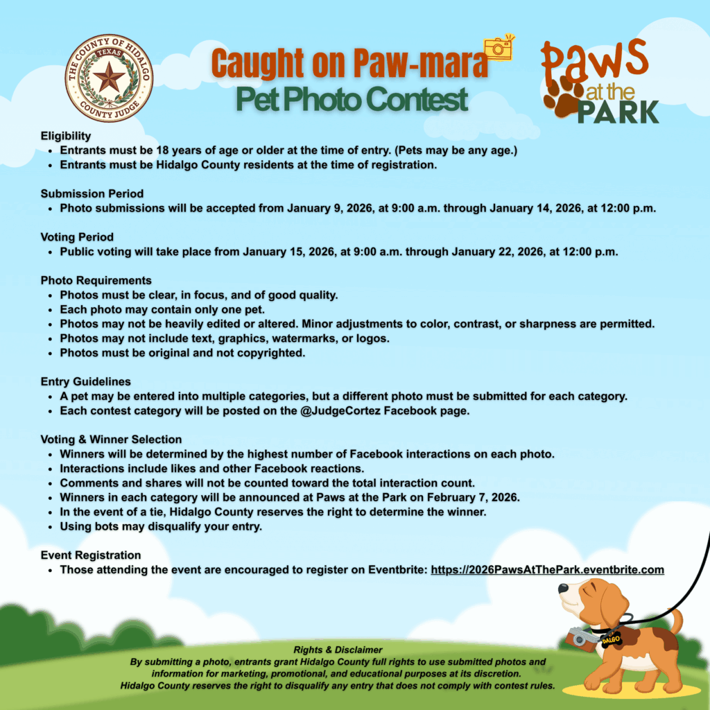 EDINBURG – Hidalgo County Judge Richard F. Cortez is inviting residents to showcase their pets’ unique personalities in the “Caught on Paw-mara” Pet Photo Contest, a fun and engaging online photo competition taking place ahead of the upcoming Paws at the Park community event in February.