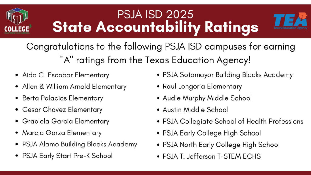 The following PSJA ISD campuses earned A’s for the 2025 School Year: Aida C Escobar Elementary, Allen & William Arnold Elementary, Berta Palacios Elementary, Cesar Chavez Elementary, Graciela Garcia Elementary, Marcia R Garza Elementary, PSJA Alamo Building Blocks Academy, PSJA Early Start Pre-K School, PSJA Sotomayor Building Blocks Academy, Raul Longoria Elementary, Audie Murphy Middle School, Austin Middle School, PSJA Collegiate School of Health Professions, PSJA Early College High School, PSJA North Early College High School, and PSJA T. Jefferson T-STEM Early College High School.